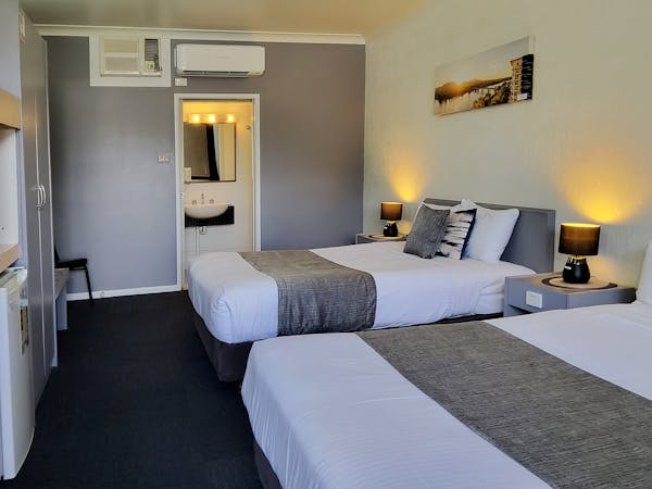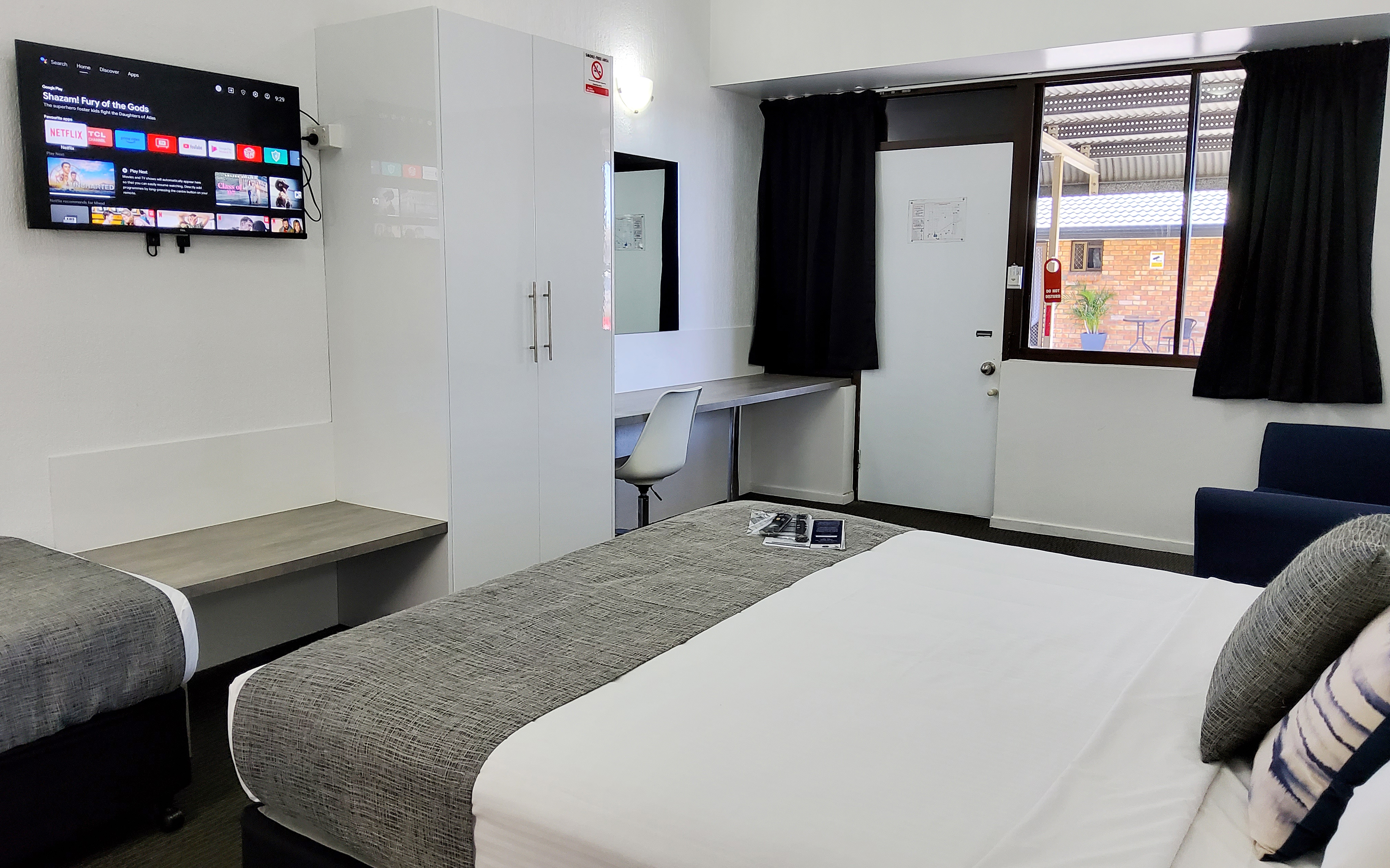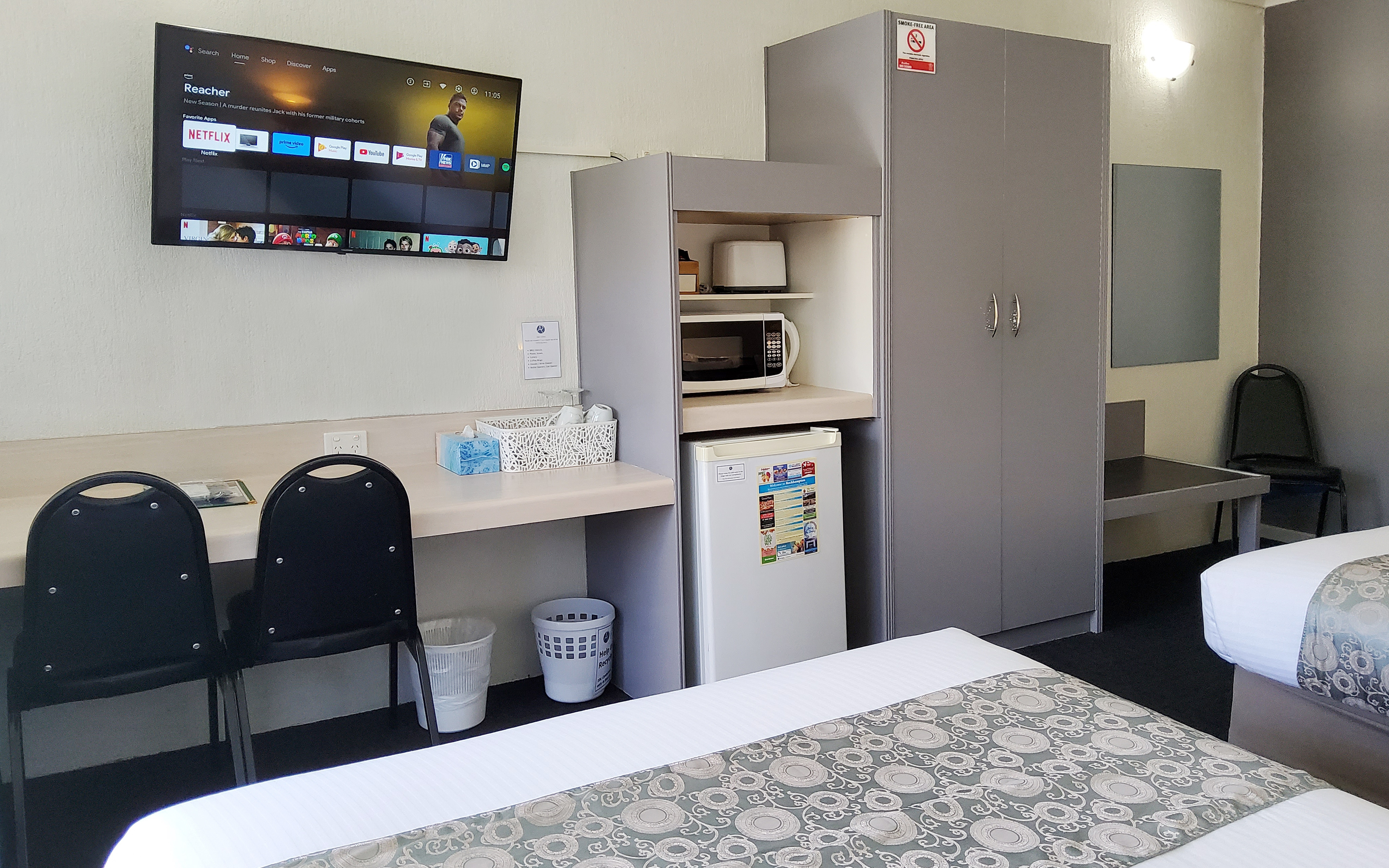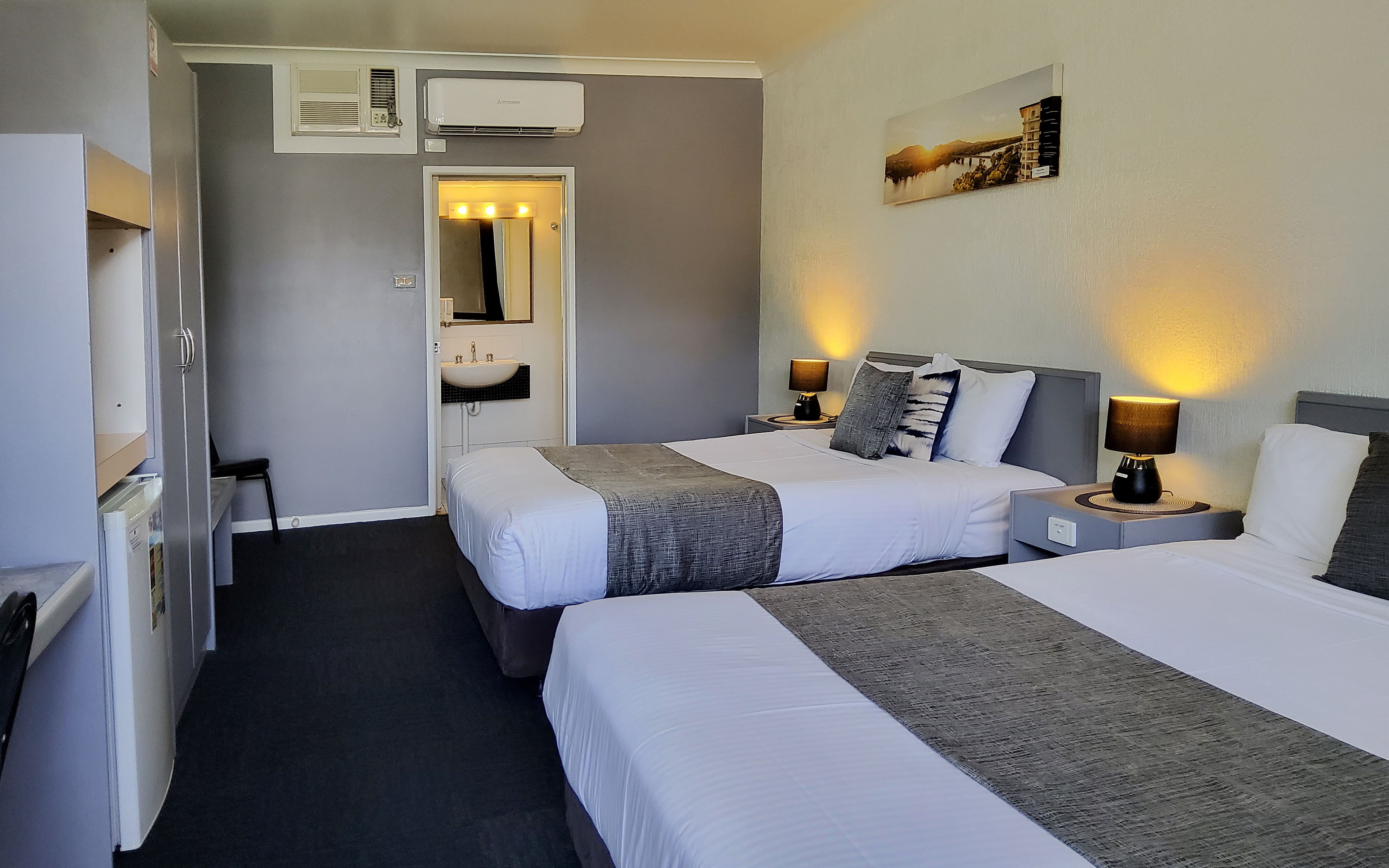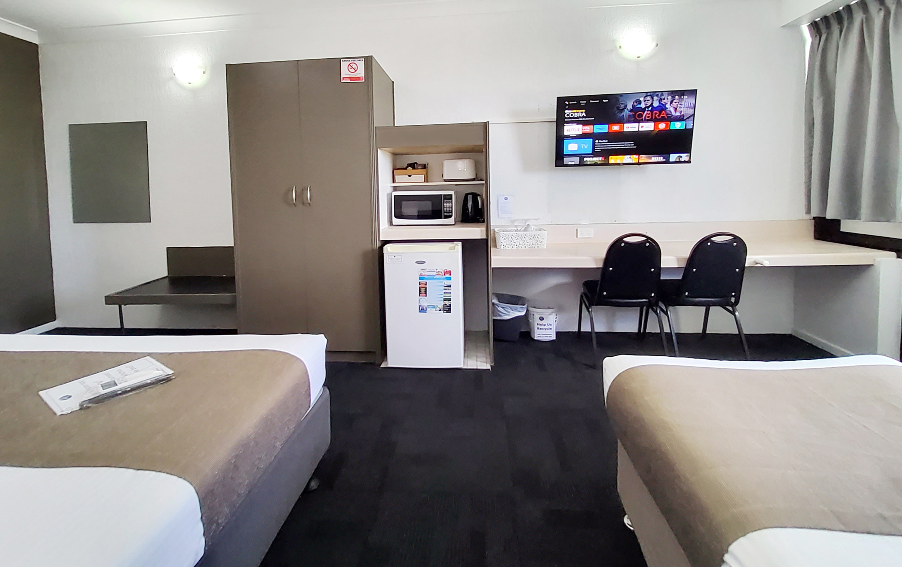 **Please note pets cannot be accommodated in this room**. Located on the first floor, these rooms have 2 Queen beds. The room has air-conditioning, flat screen smart TV, tea & coffee facilities, bar fridge, microwave, toaster, hairdryer, iron, ironing board, free wi-fi.