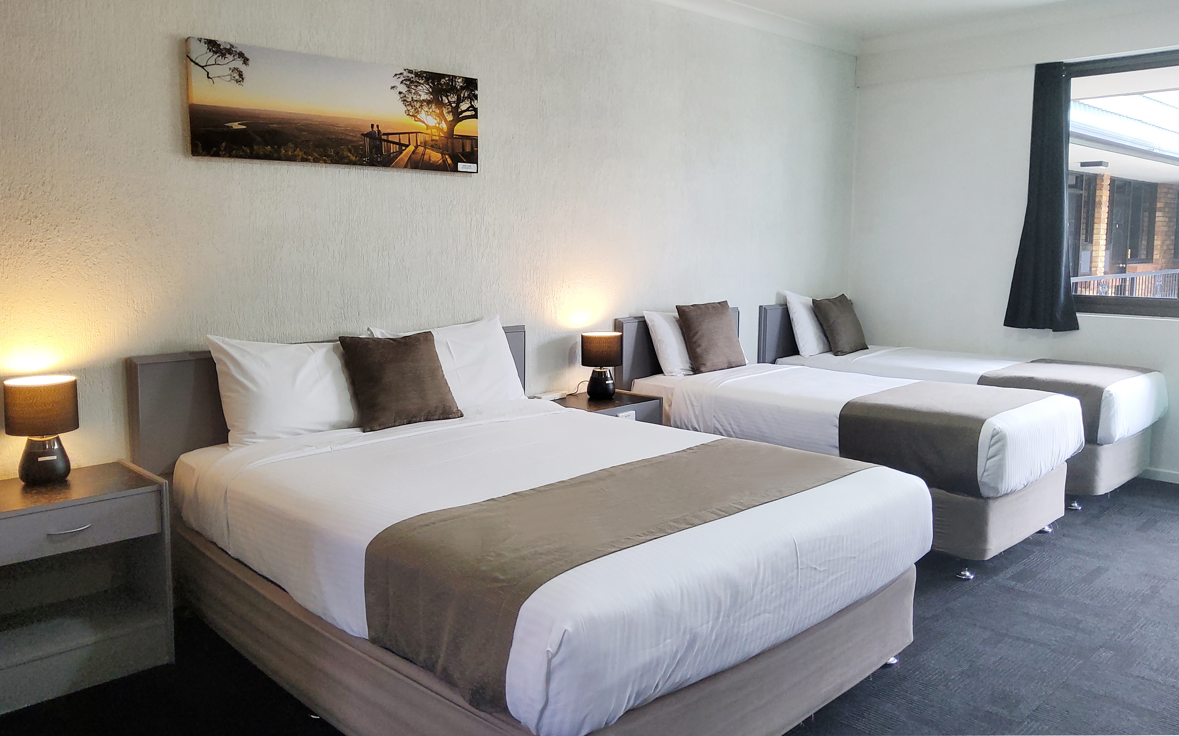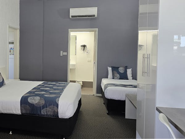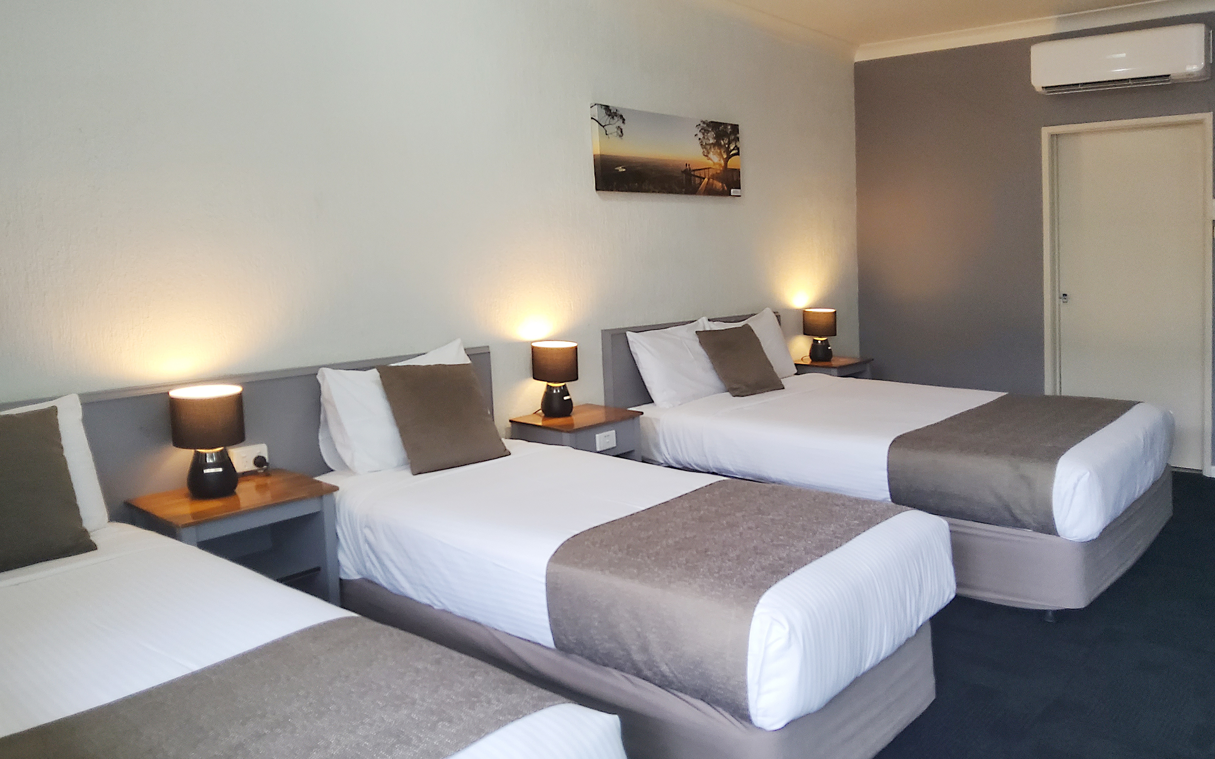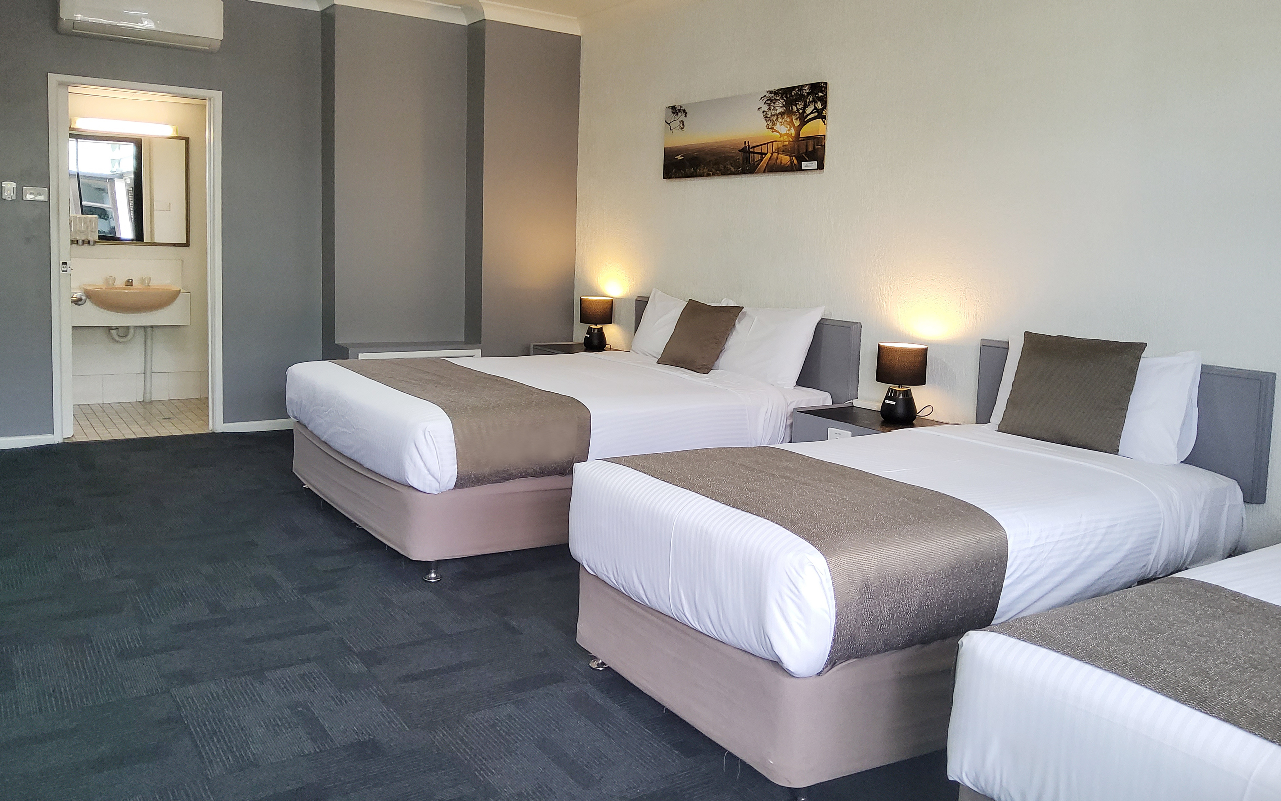 **Please note pets cannot be accommodated in this room**. Located on the first floor, these rooms have a Queen size bed and 2 Single beds. The room has an en-suite, air-conditioning, flat screen smart TV, tea & coffee facilities, bar fridge, microwave, toaster, hairdryer, iron, ironing board, free wi-fi.