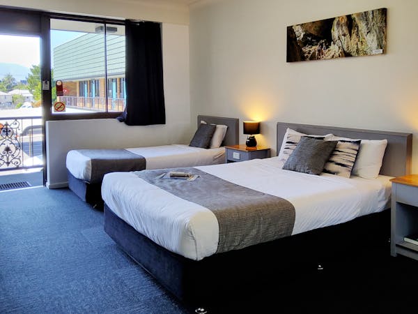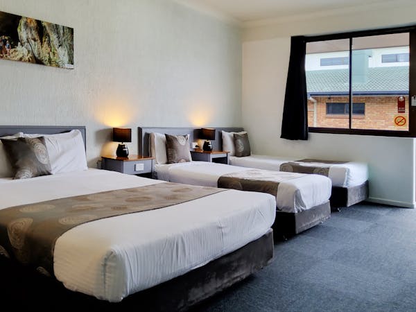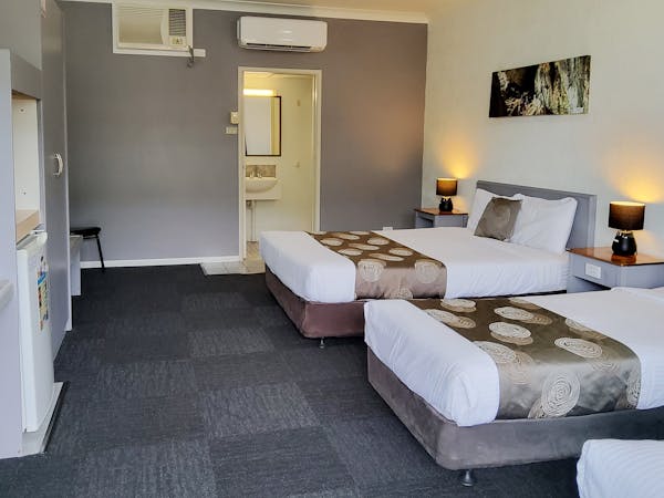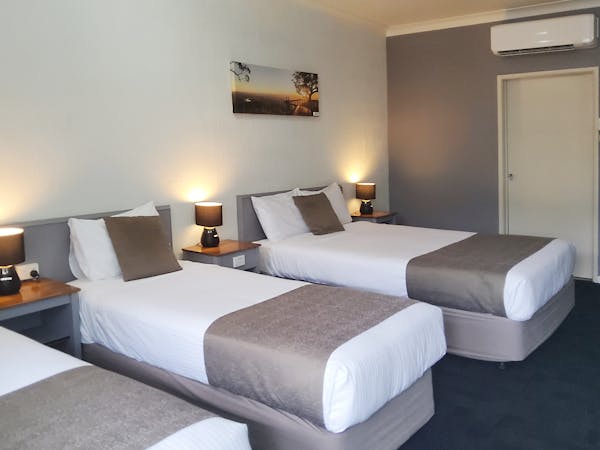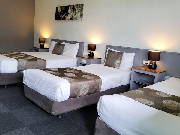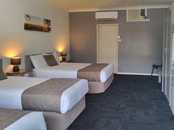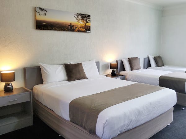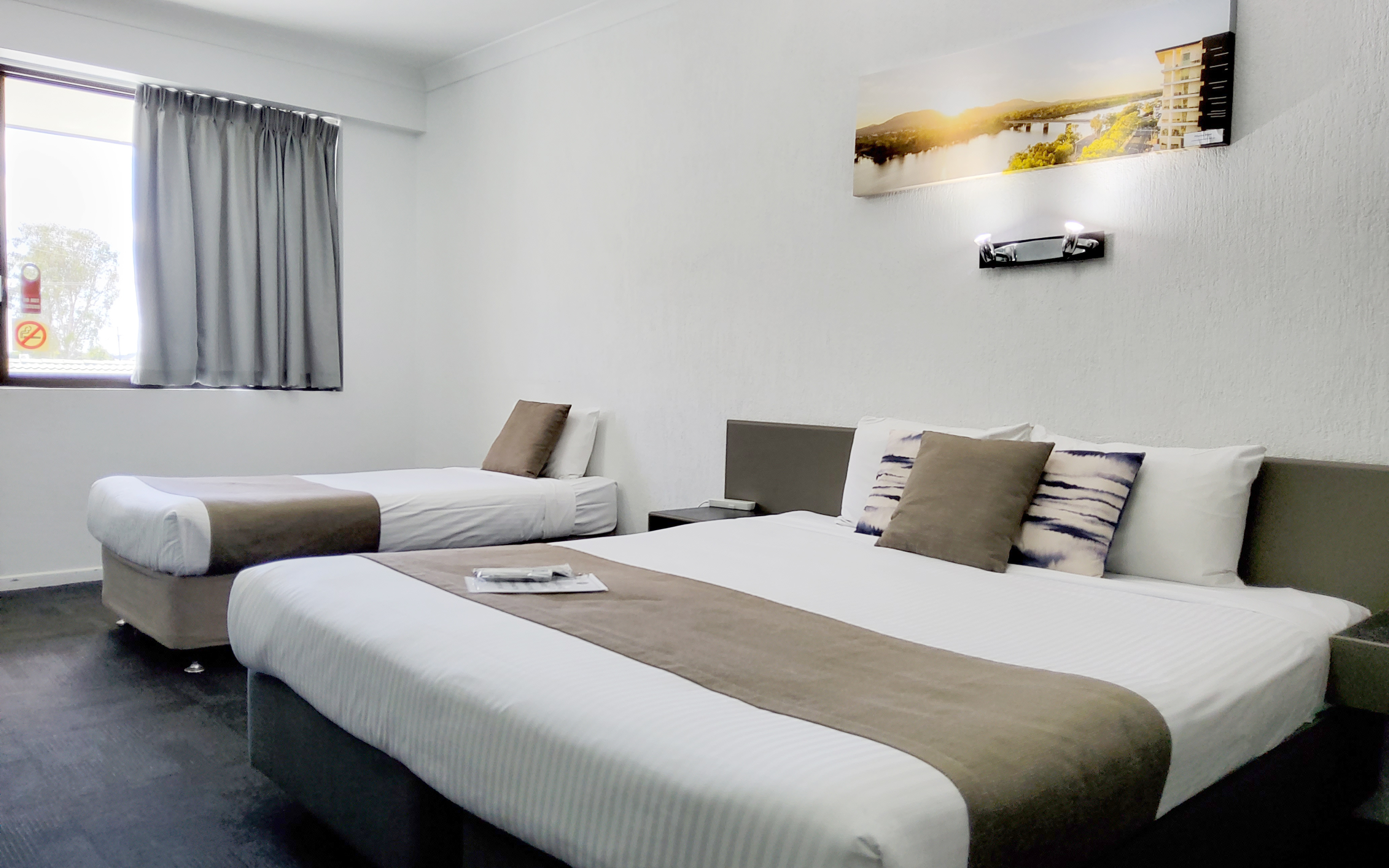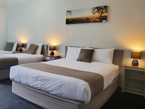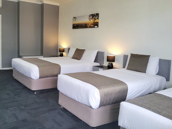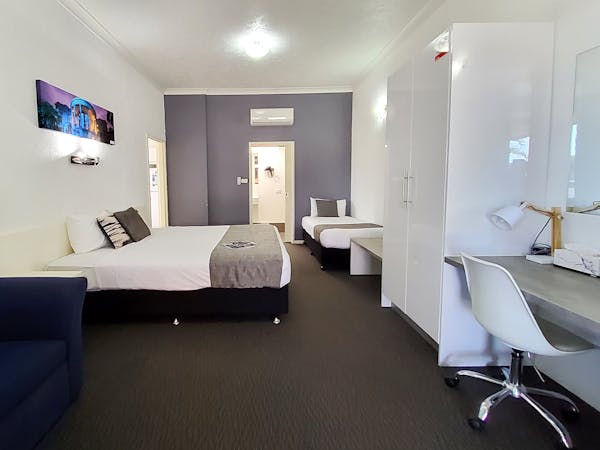 **Please note pets cannot be accommodated in this room**. Located on the first floor, these rooms have a Queen size bed and 2 Single beds. The room has an en-suite, air-conditioning, flat screen smart TV, tea & coffee facilities, bar fridge, microwave, toaster, hairdryer, iron, ironing board, free wi-fi.
