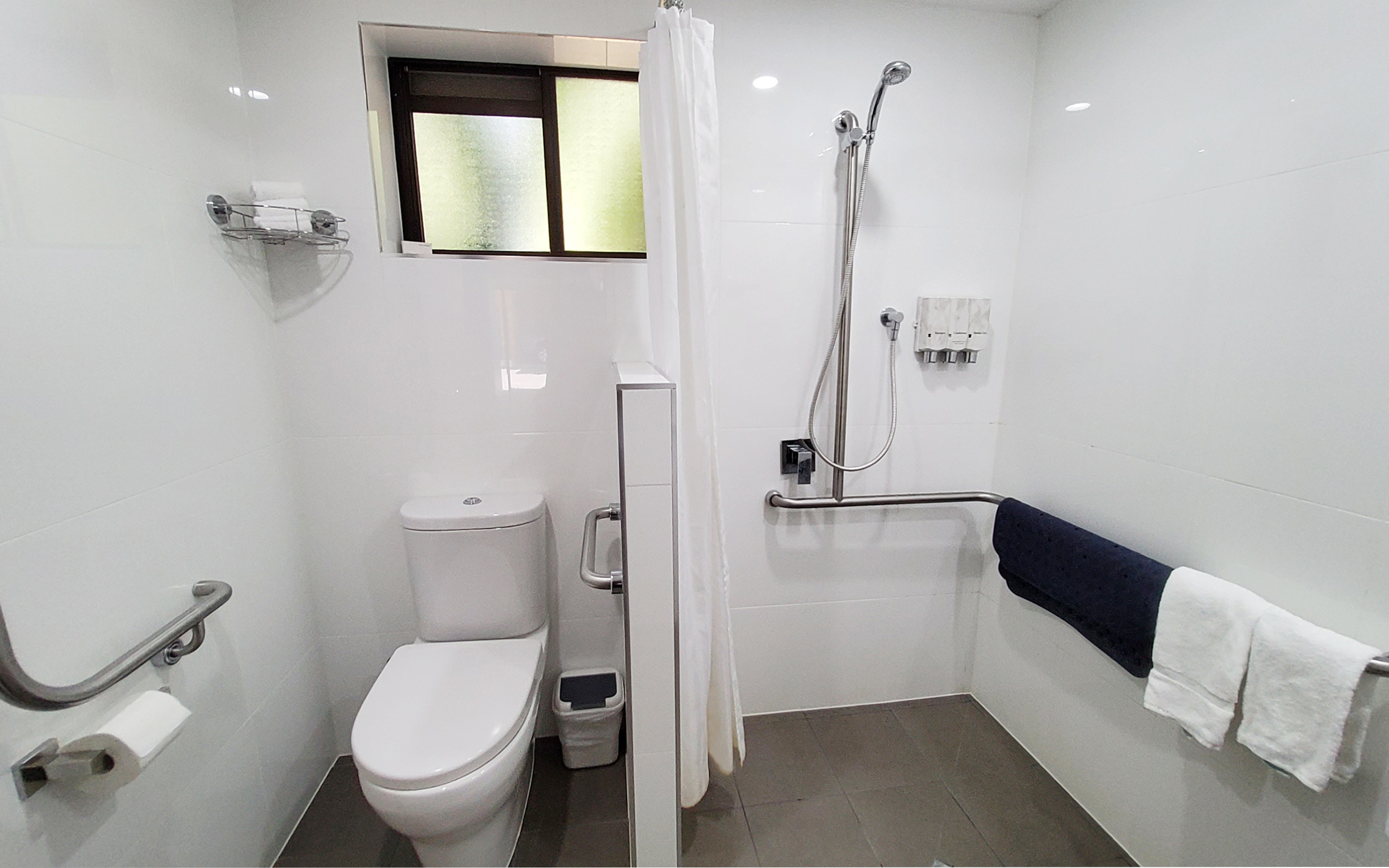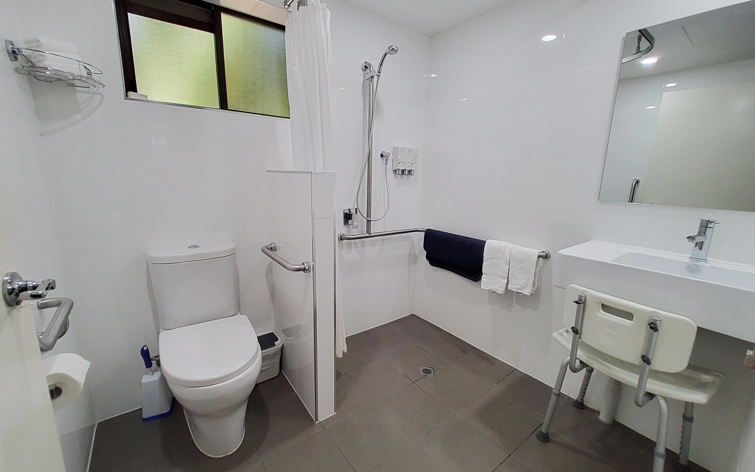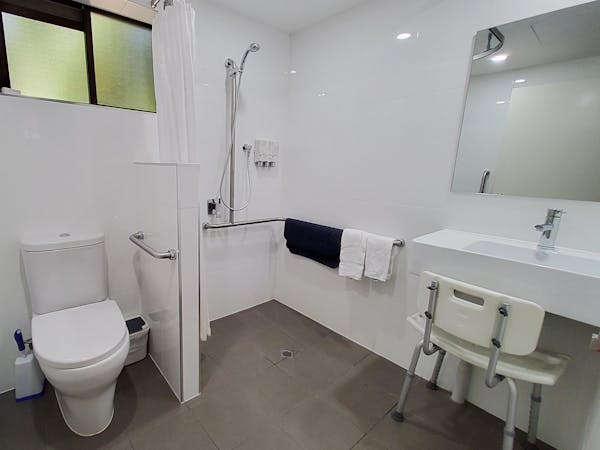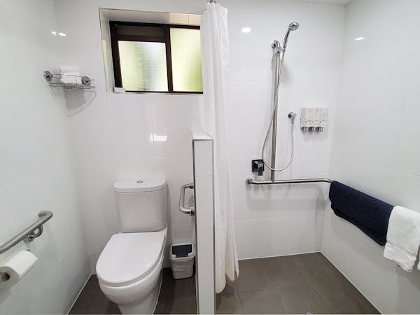 **Please note pets cannot be accommodated in this room**. Ground floor room with wheelchair access entry, convenient parking, a King bed and Single bed, an en-suite with wheelchair access, handrails, shower chair. The room has air-conditioning, flat screen smart TV, tea & coffee facilities, bar fridge, microwave, toaster, hairdryer, iron, ironing board, free wi-fi.