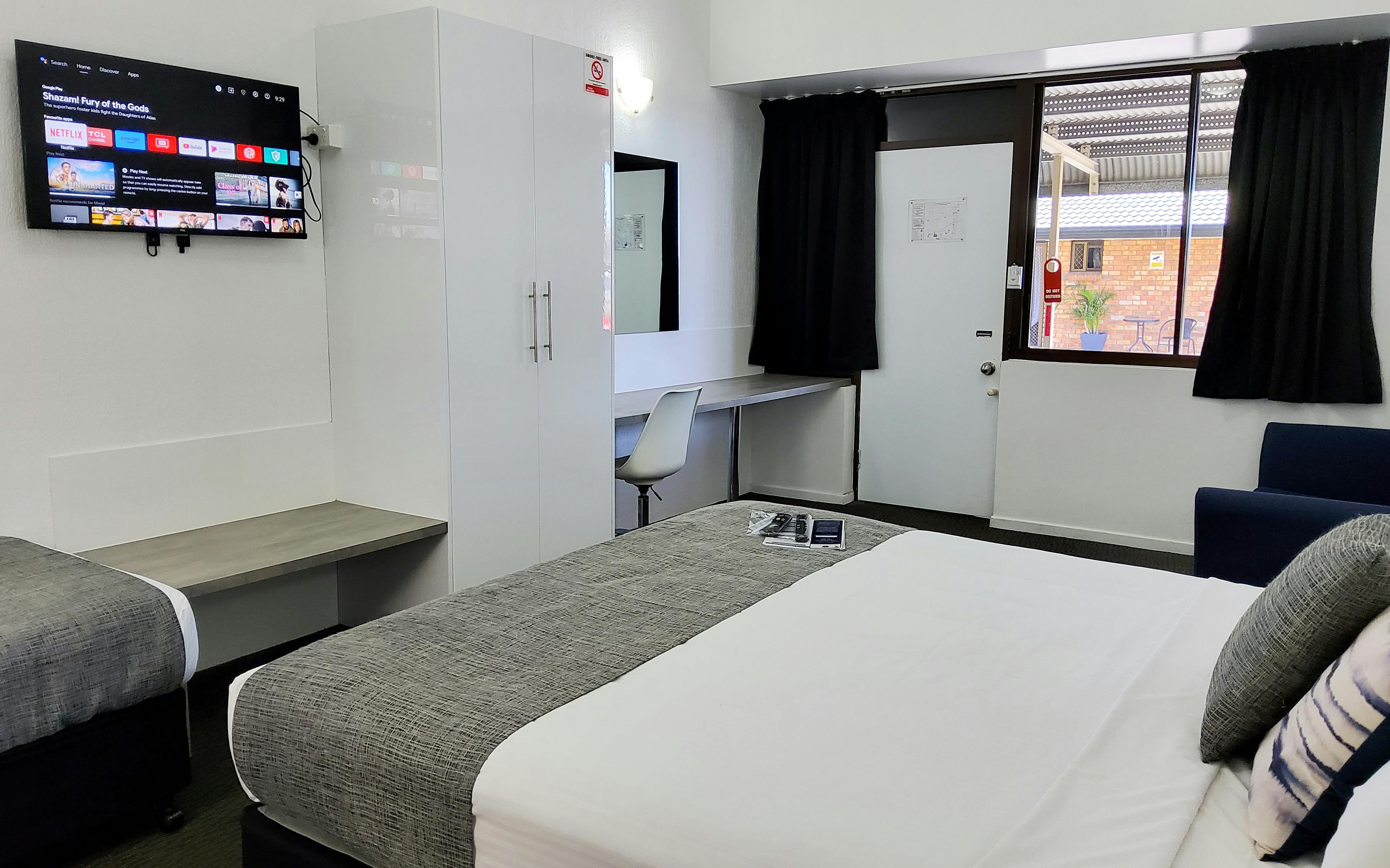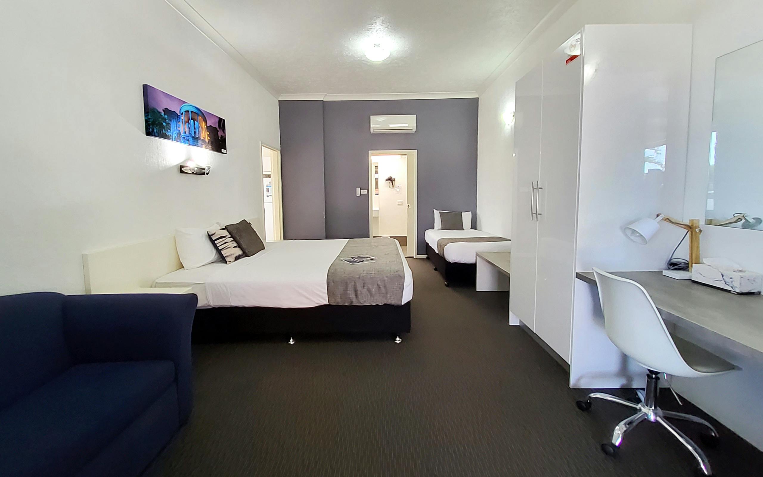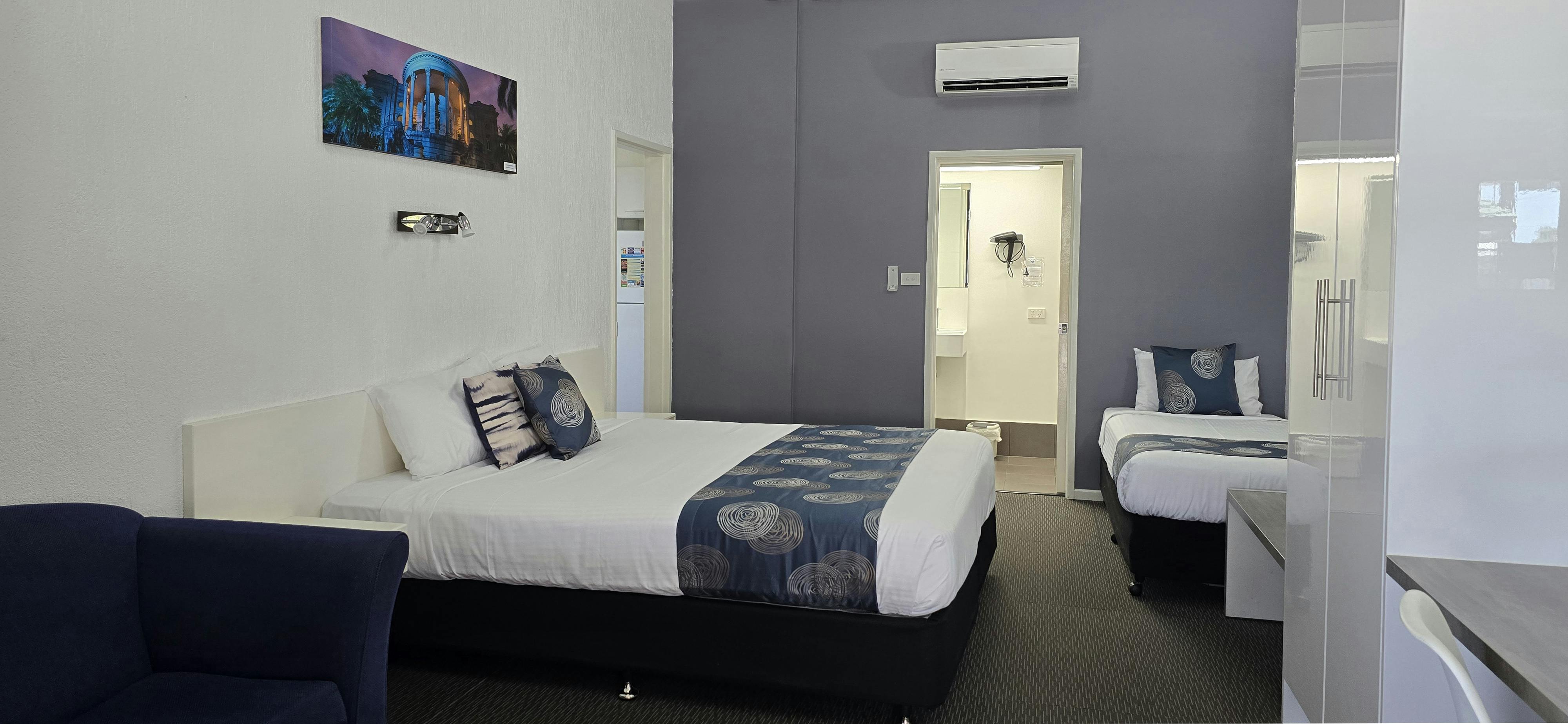 **Please note pets cannot be accommodated in this room**. Located on either the ground or first floor, these spacious suites have a King size bed and Single bed. The room has an en-suite, air-conditioning, kitchenette and dining area, flat screen smart TV, tea & coffee facilities, full refrigerator, microwave, toaster, hairdryer, iron, ironing board, free wi-fi.